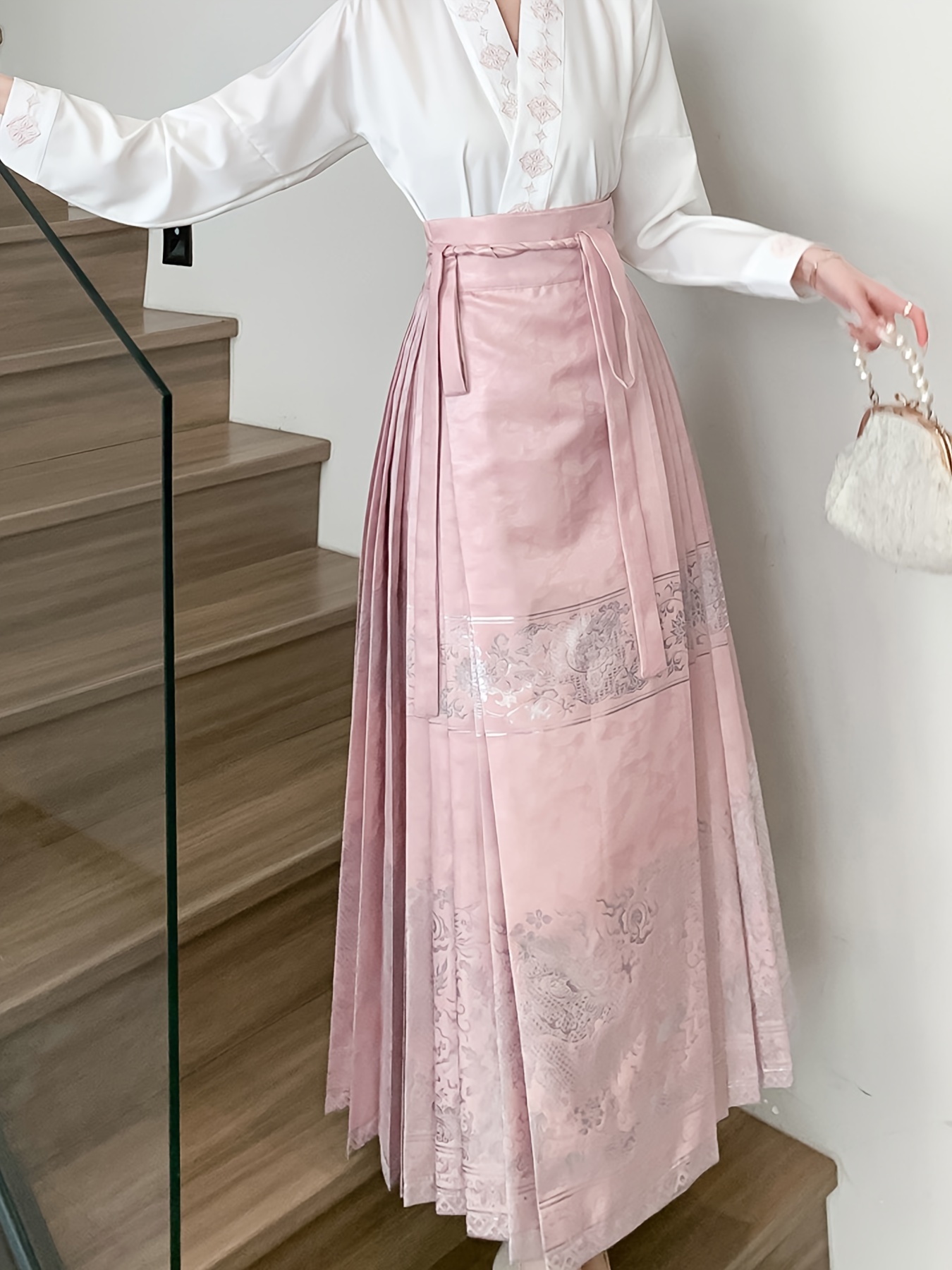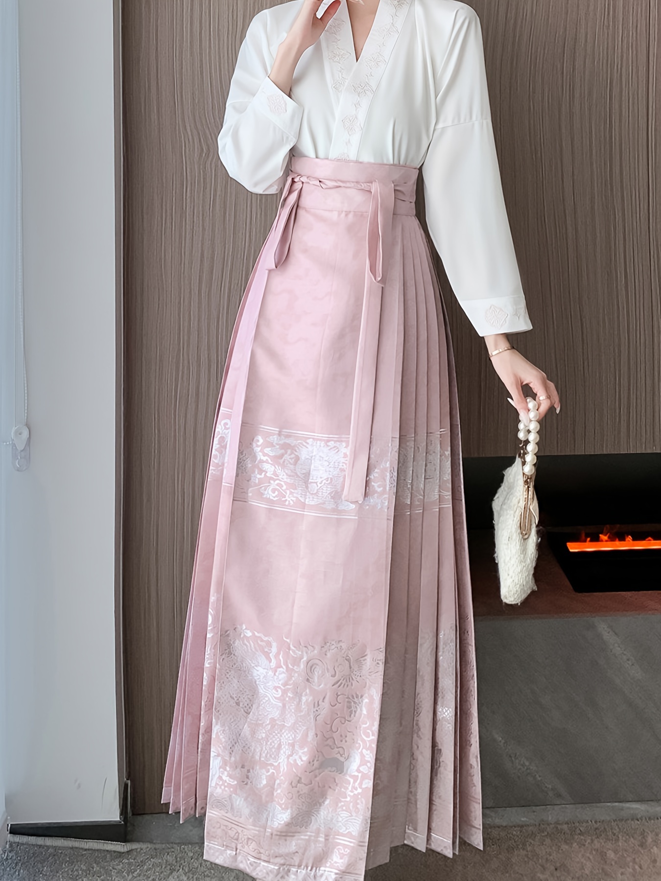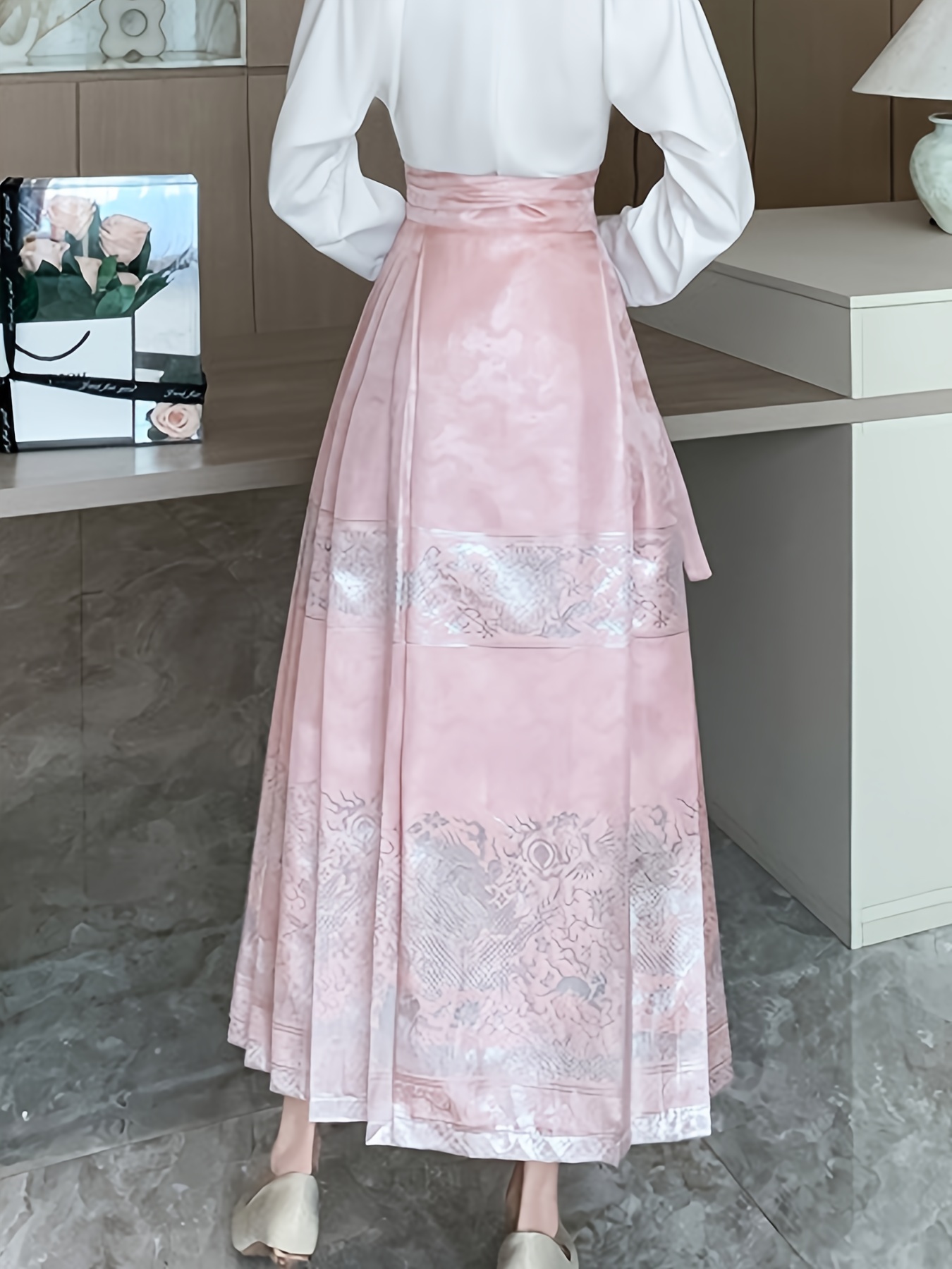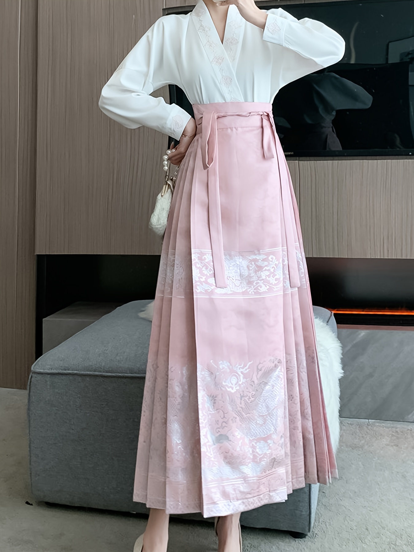 • Floral Print High Waist Skirt, Casual Pleated Tie Waist Chinese Horse Face Skirt For Festival, Women's Clothing