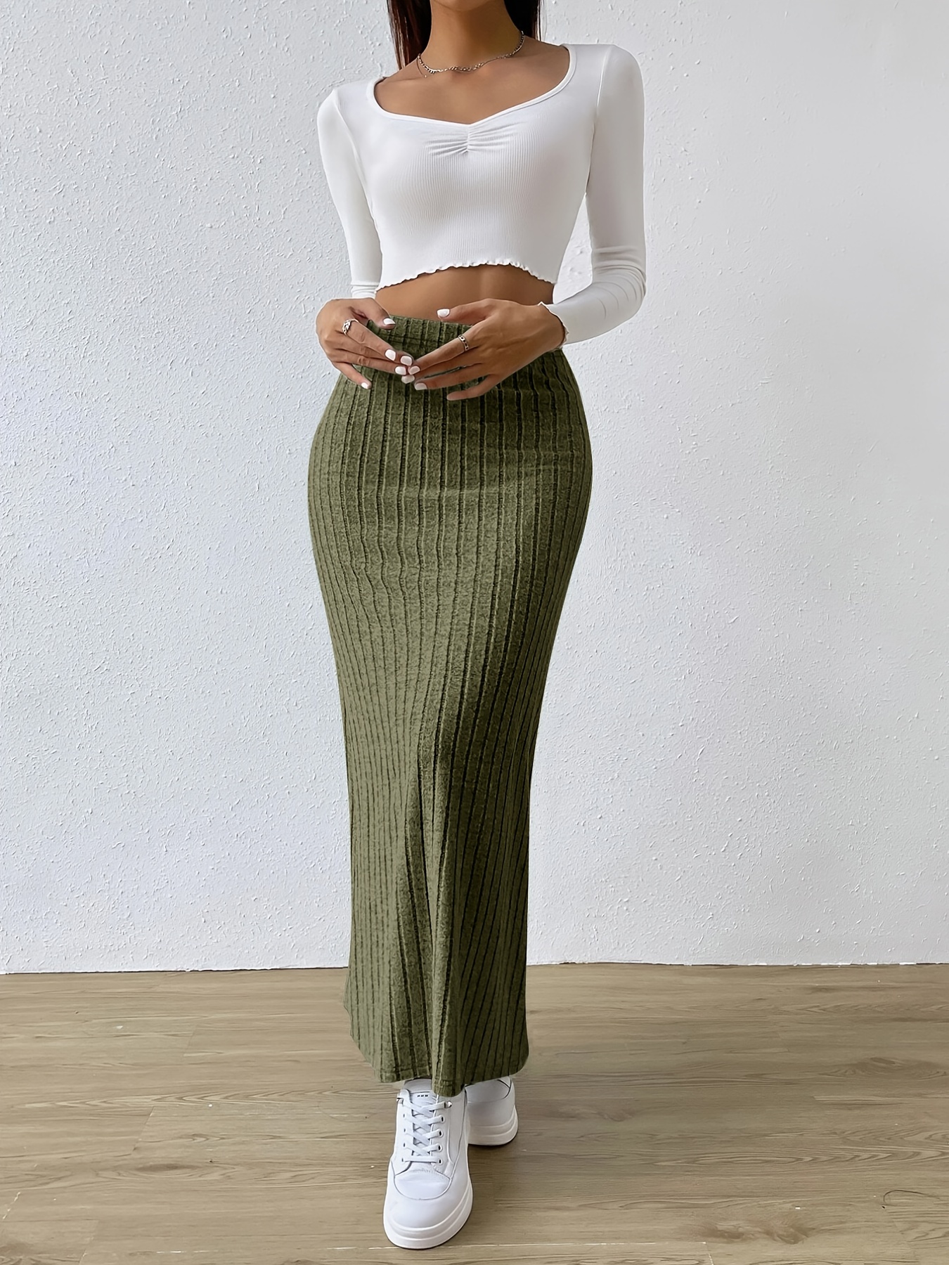 • Solid Ribbed High Waist Skirt, Casual Ankle Length Bodycon Skirt, Women's Clothing